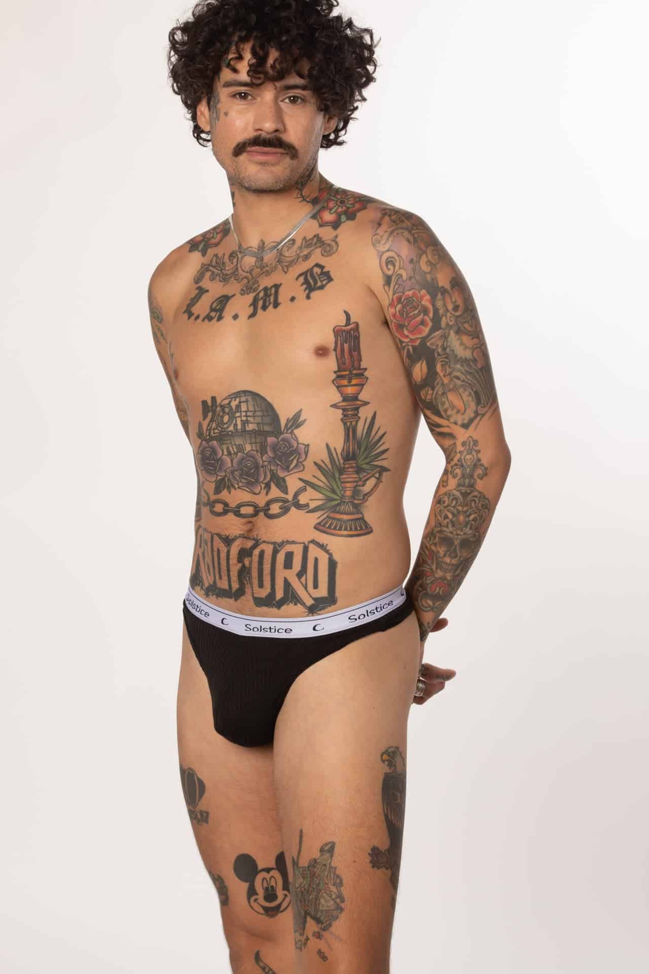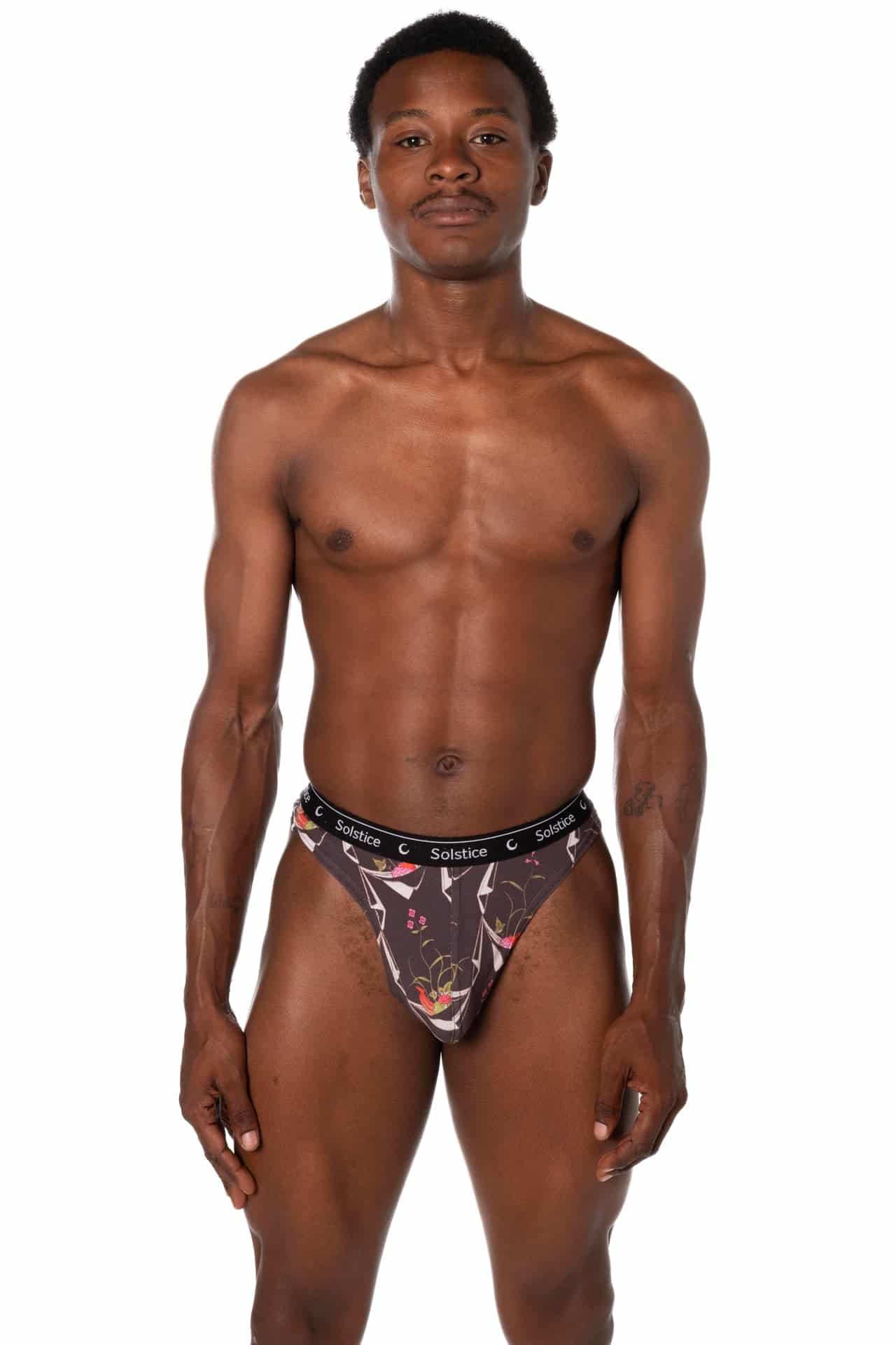 Thong jock underwear in our ribbed knit and printed cotton. trimmed with matching picot elastic.