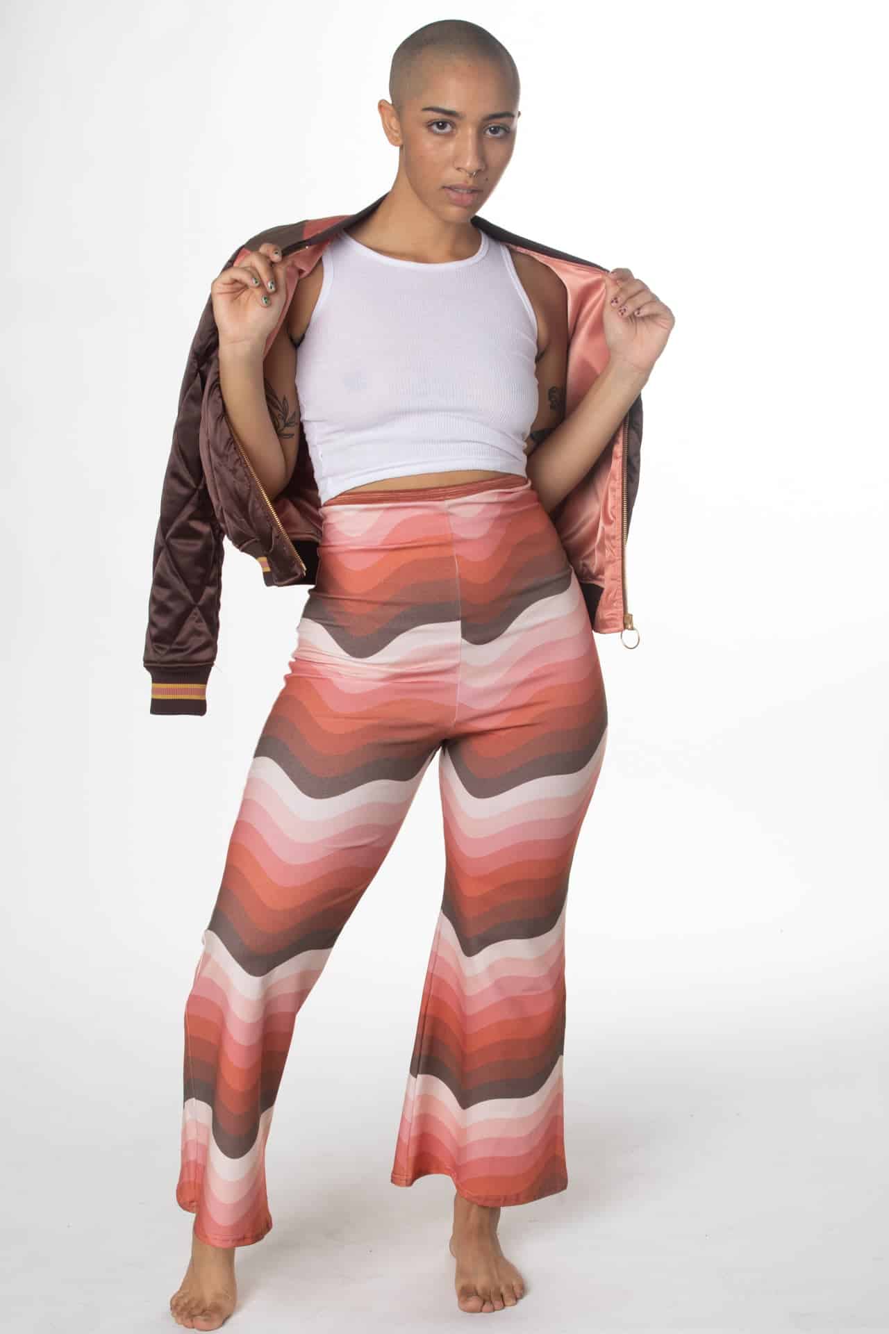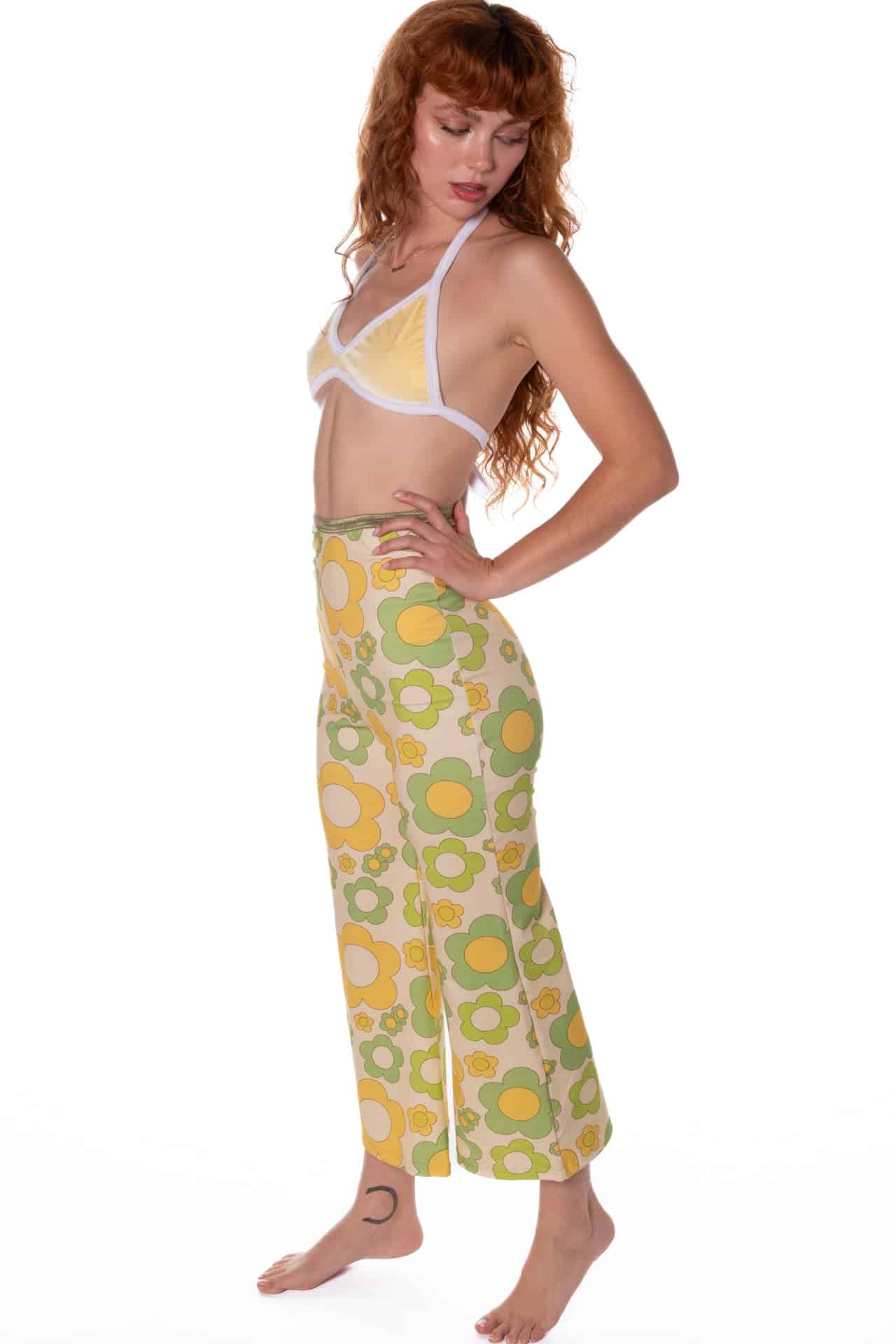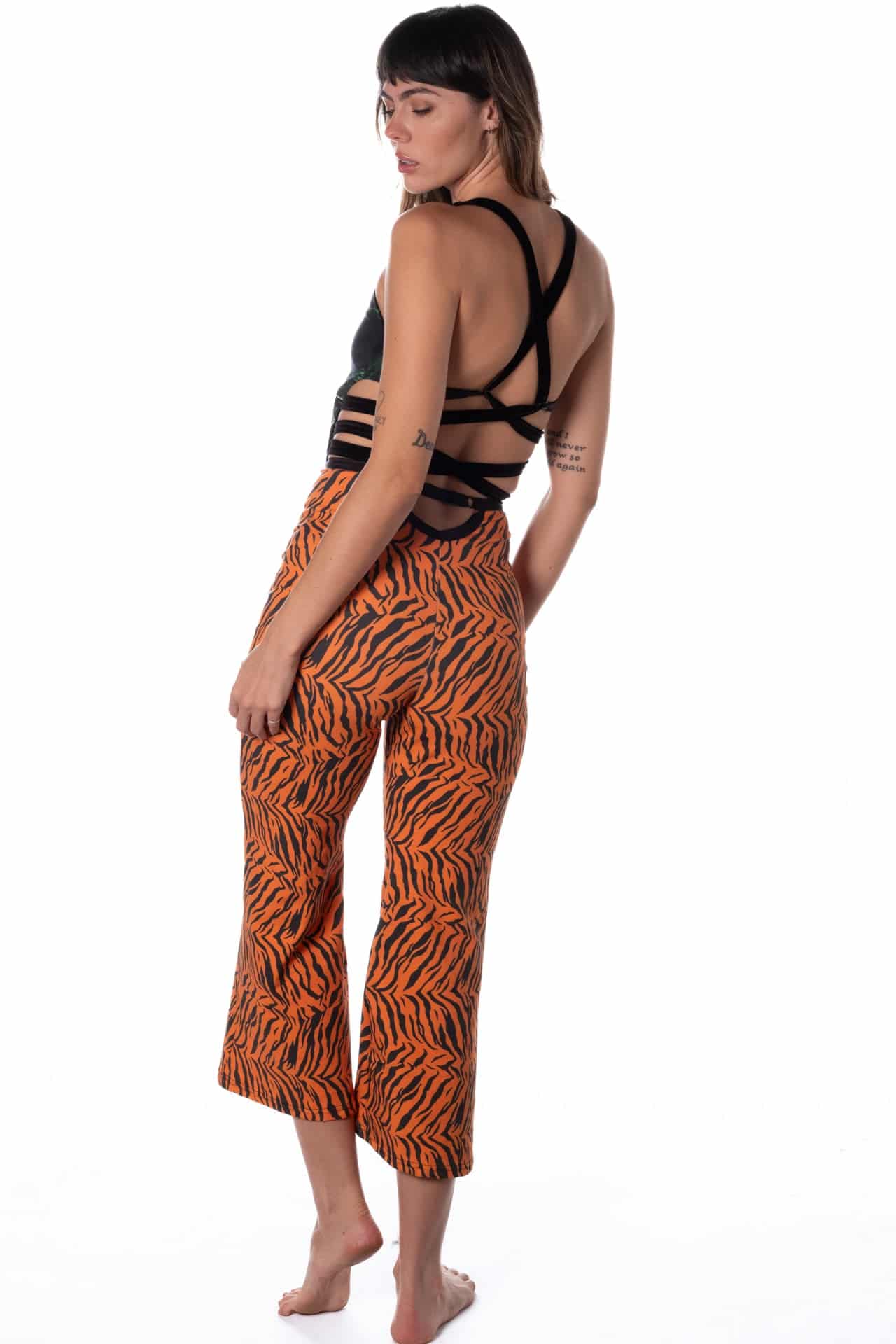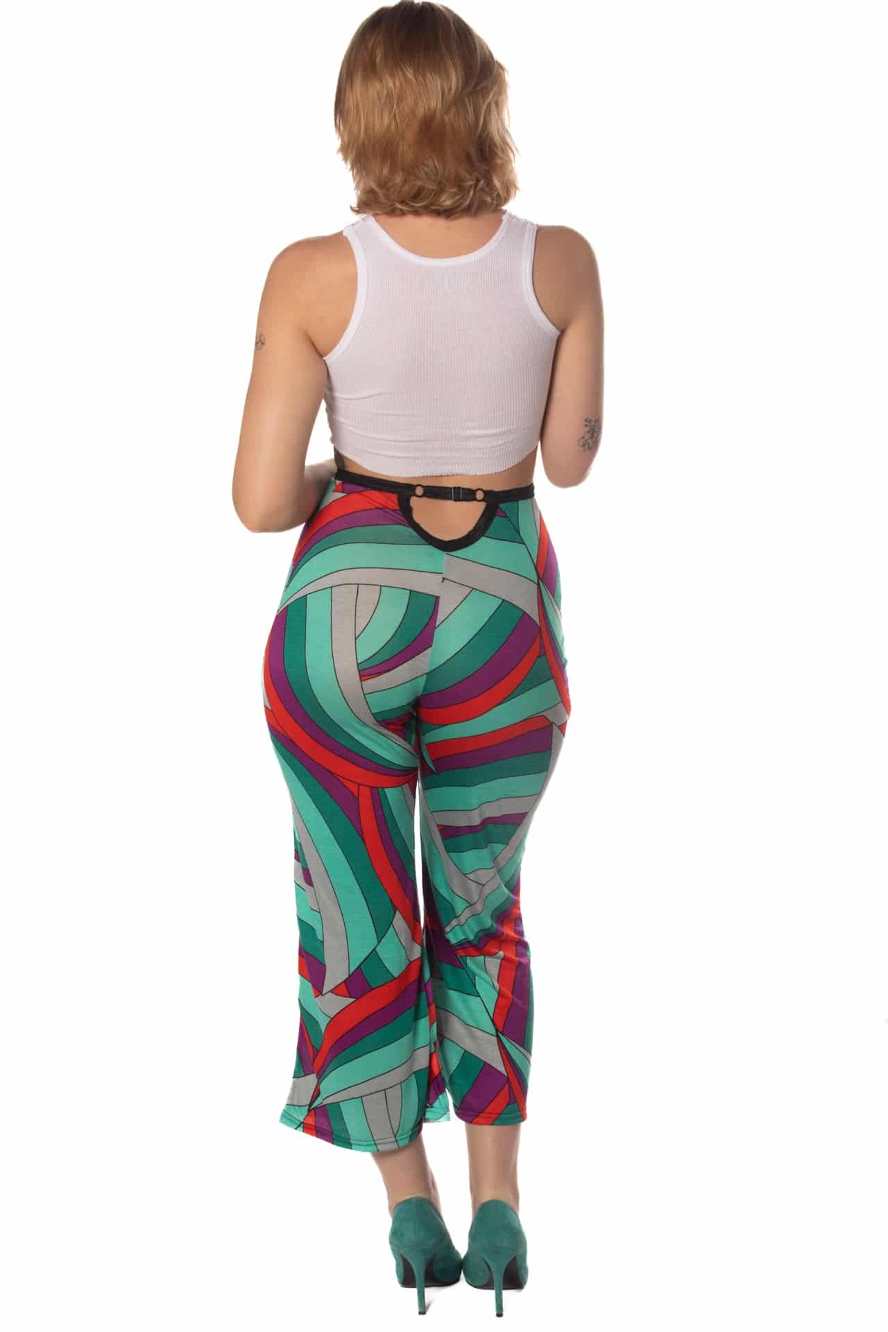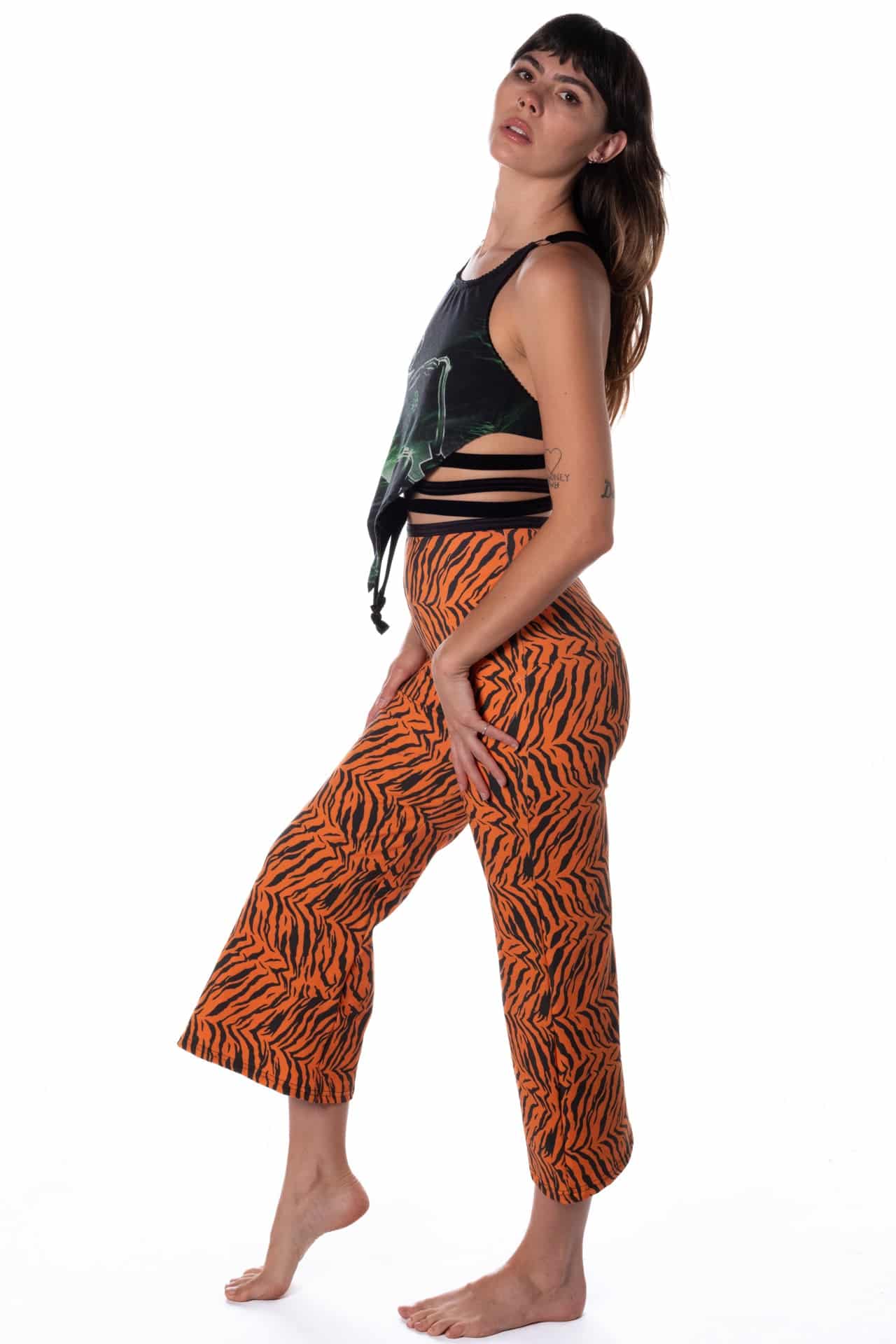 Our high-waisted wide-leg cropped pant in soft ribbed and printed stretch cotton. The back features our signature scoop cutout and an adjustable waist strap.