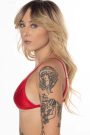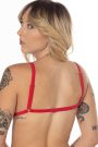 Ready to ship!!!! Triangle swim top in a red fabric with red trim. Swim top is lined and features fully adjustable shoulder and back straps.