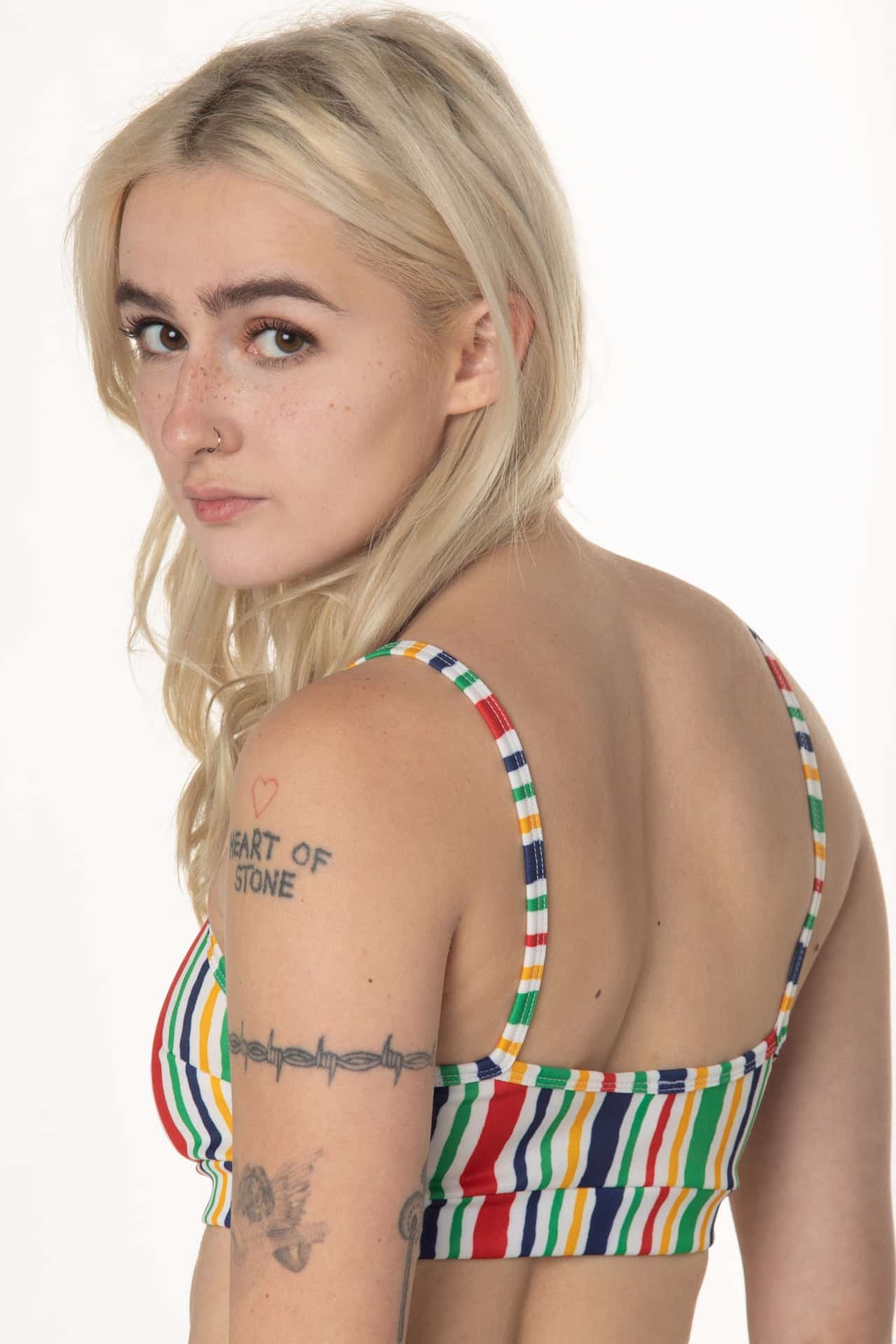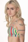 Ready to ship!!!! Shop our track bralette! Bralette features a multicolored vertically striped print in vintage deadstock fabric.