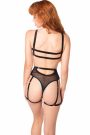Everyday bralette and high waisted harness thong underwear set in a space themed black embroidered mesh. The bralette has an everyday cup with fully adjustable shoulder and back straps. Underwear has a black stretch mesh back with a scoop cutout, an adjustable waist strap and fully adjustable leg harnesses.