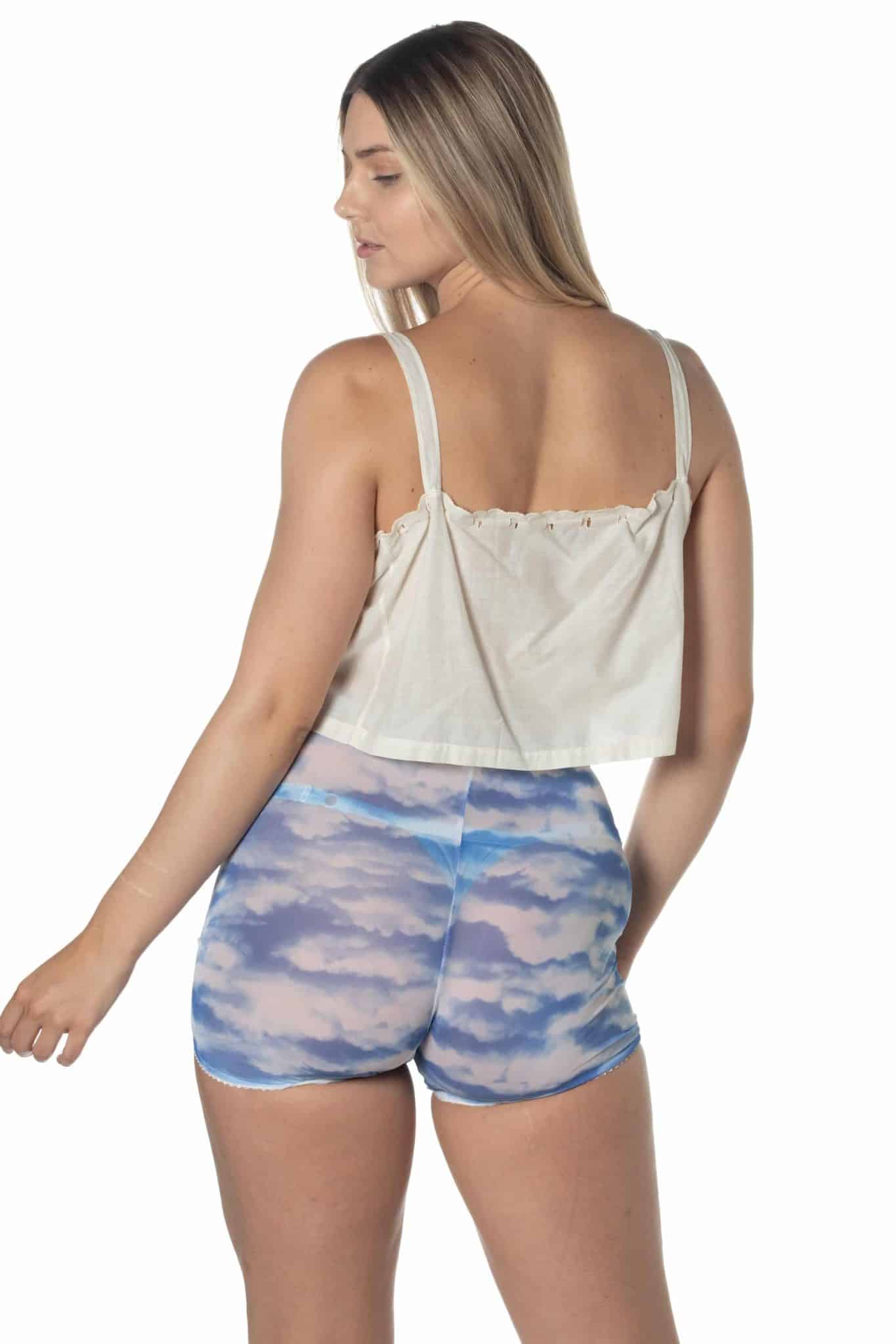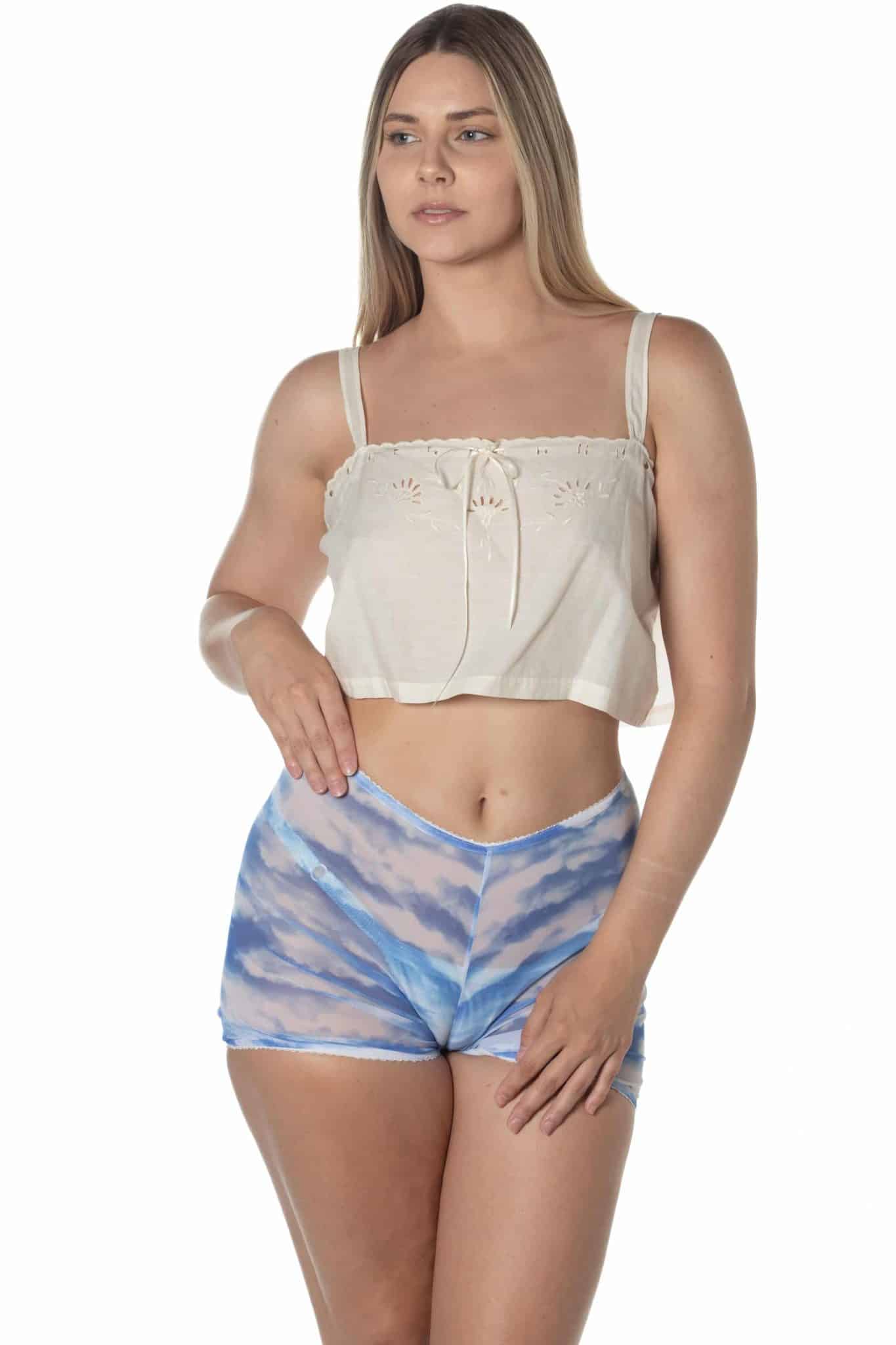 Bloomer shorties in our sheer stretch mesh. Featuring a scalloped picot waistband. Model is wearing colorway: Jag Model is wearing size: Medium 92% Nylon 8% Spandex. Gently wash by hand and lay flat to dry.