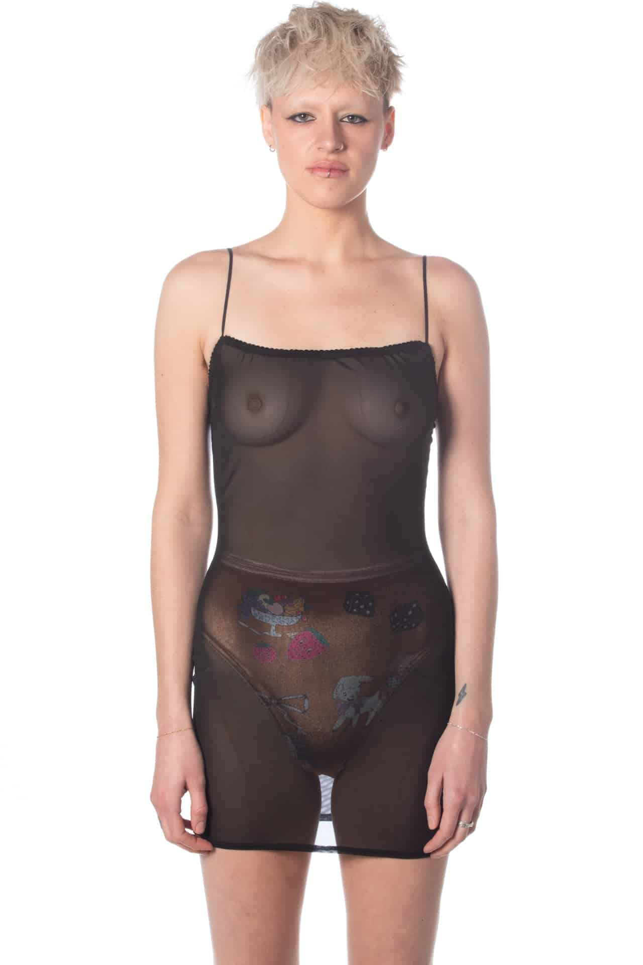 Our take on a body-con mini in our sheer stretch mesh. The dress features a low back, picot trim on the top and has matching tiny spaghetti straps.