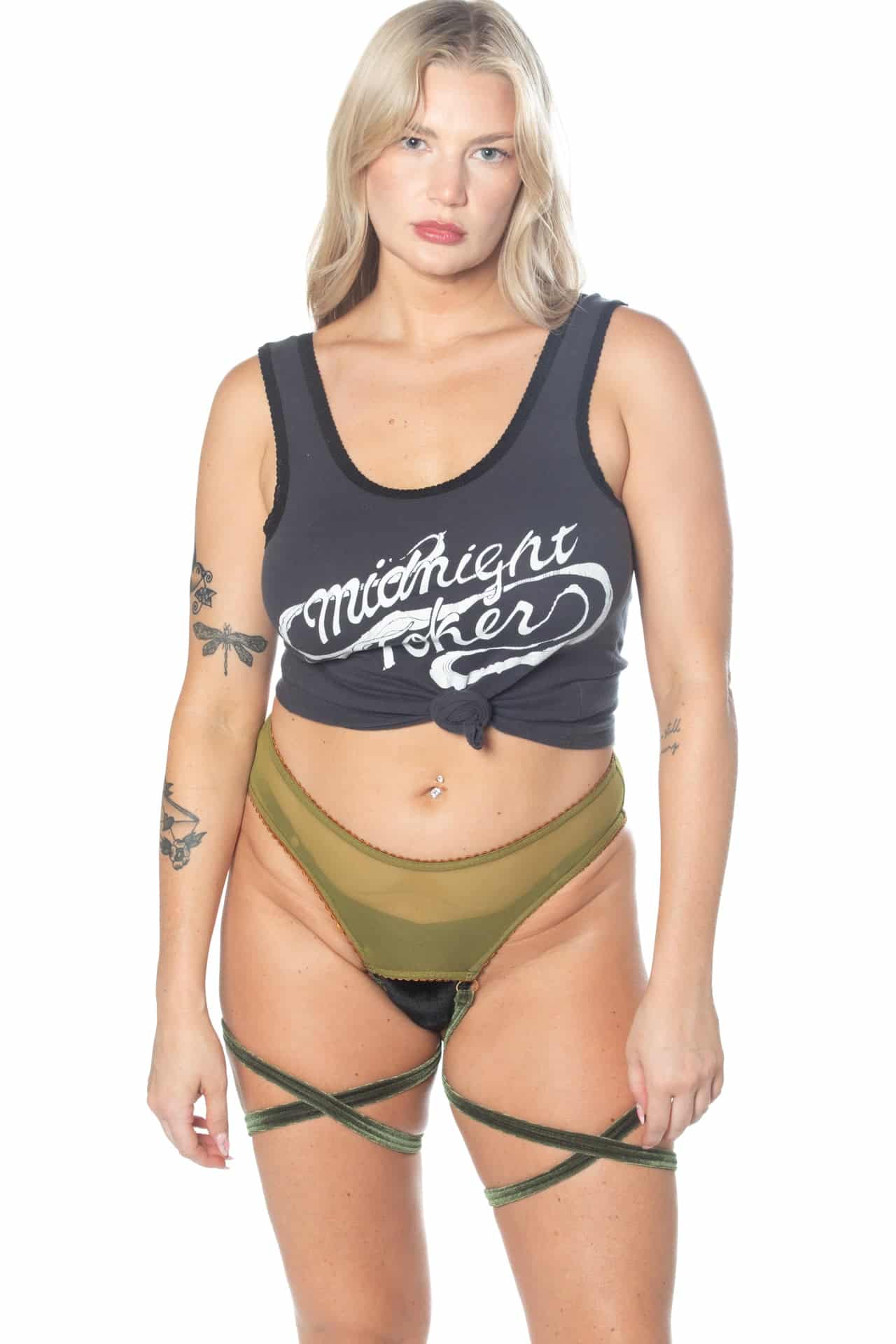 Handmade with our softest solid mesh fabric, our low-waisted underwear boasts an open gusset and matching velvet leg ties.