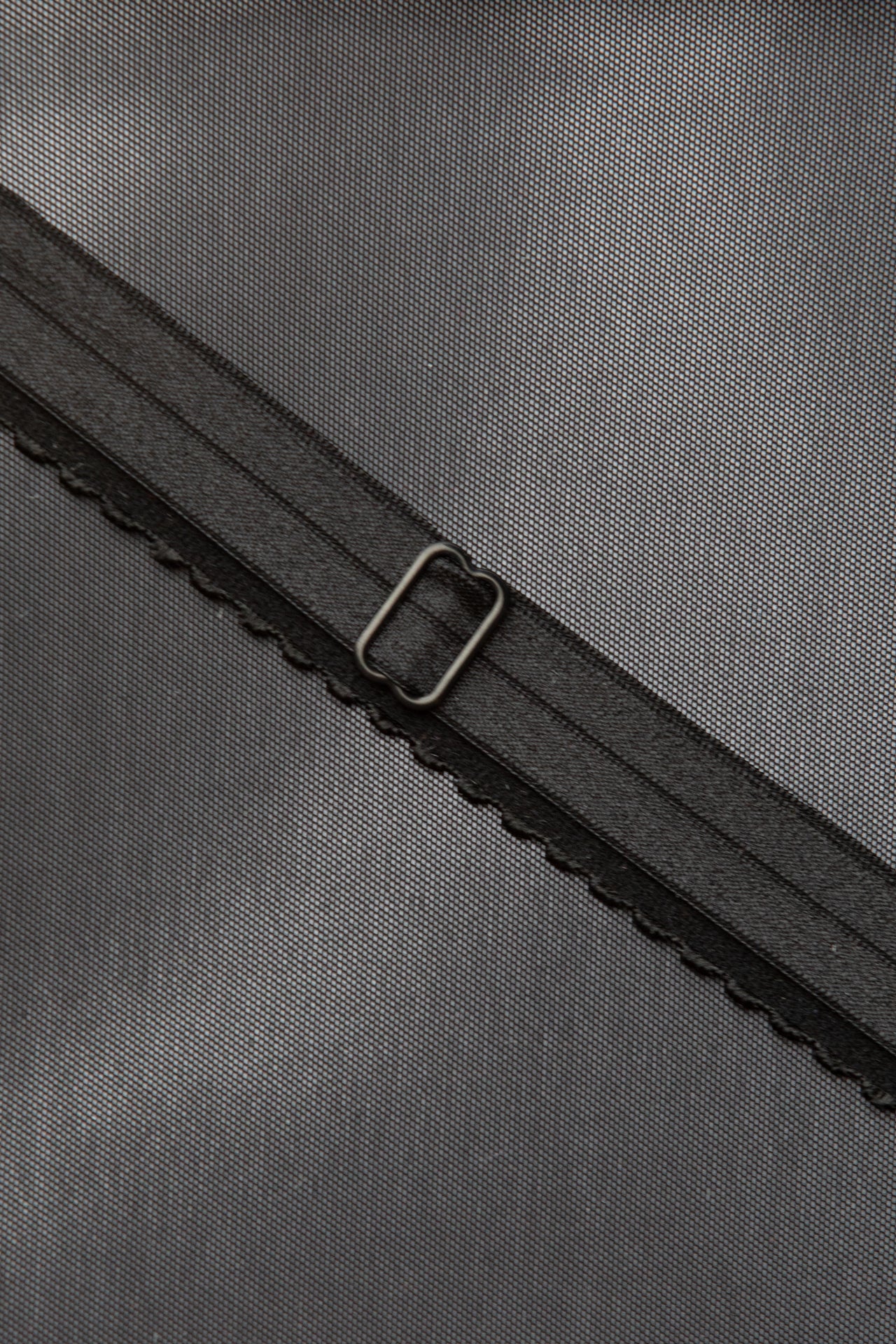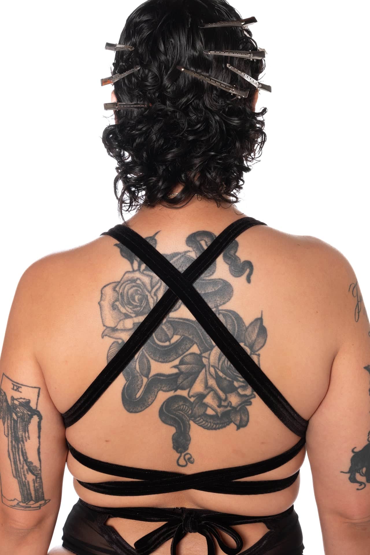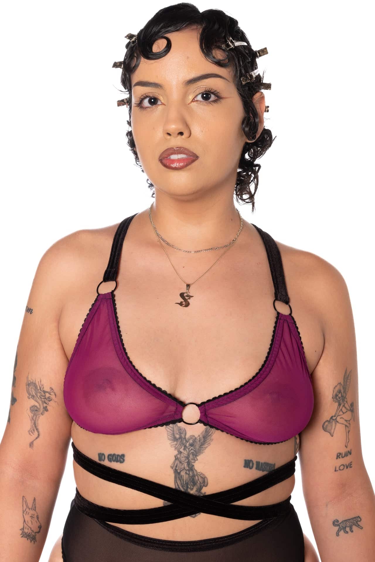 Sheer mesh fabric triangle bralette. The cups boast a matching ring in the center and long velvet ties that crisscross in the back, wrapping around and tying at the waist.