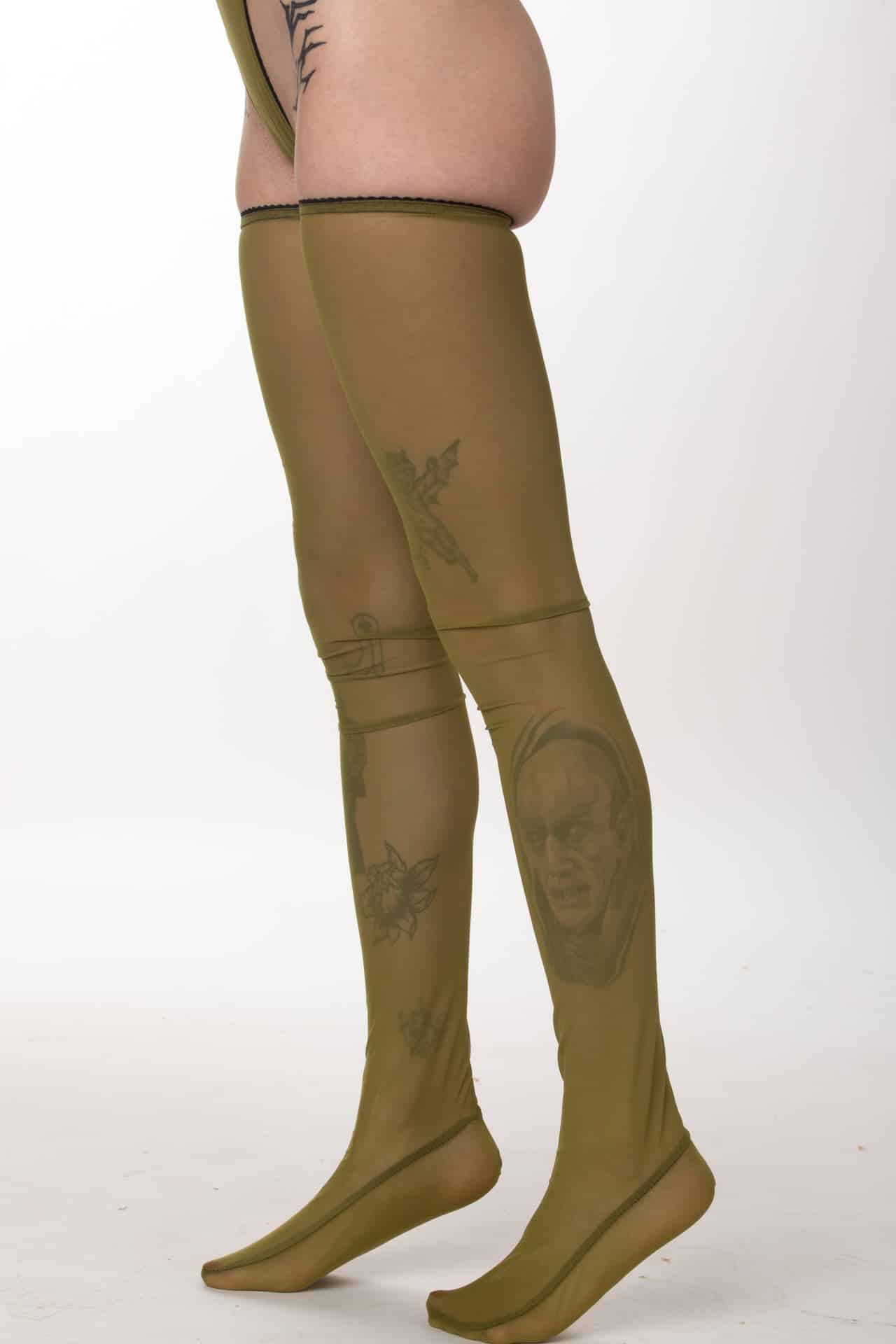Our sheer stretch mesh over the knee socks feature a romantic seam up the back.