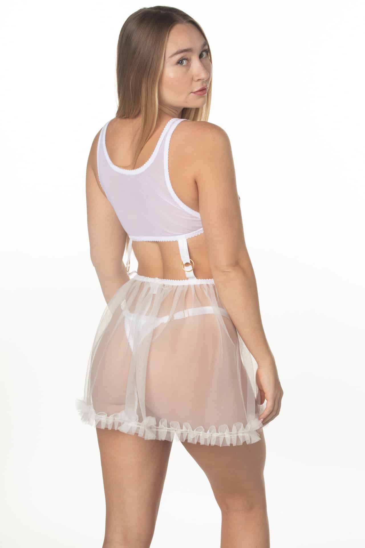 Fall in love with this dress! Dress features a white lace petal crop bralette attached to a mesh skirt with low-rider thong underwear. The front of the petal crop is made with a lace fabric and soft cup with mesh lining on the back. Top is fastened to the skirt with white elastic and gold loop hardware. Set features lace low-rider thong underwear with adjustable hip straps.