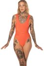Ready to ship!!! One-piece swimsuit with a cheeky high-hip cut in a sparkly orange swim fabric. Featuring a low scoop back and long matching ties that can be wrapped and tied any way you like. Swimsuit IS fully lined.