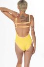 Ready to ship!!! One-piece swimsuit features cheeky cut leg-holes in a yellow swim fabric with peach trim. Swimsuits are fully lined.