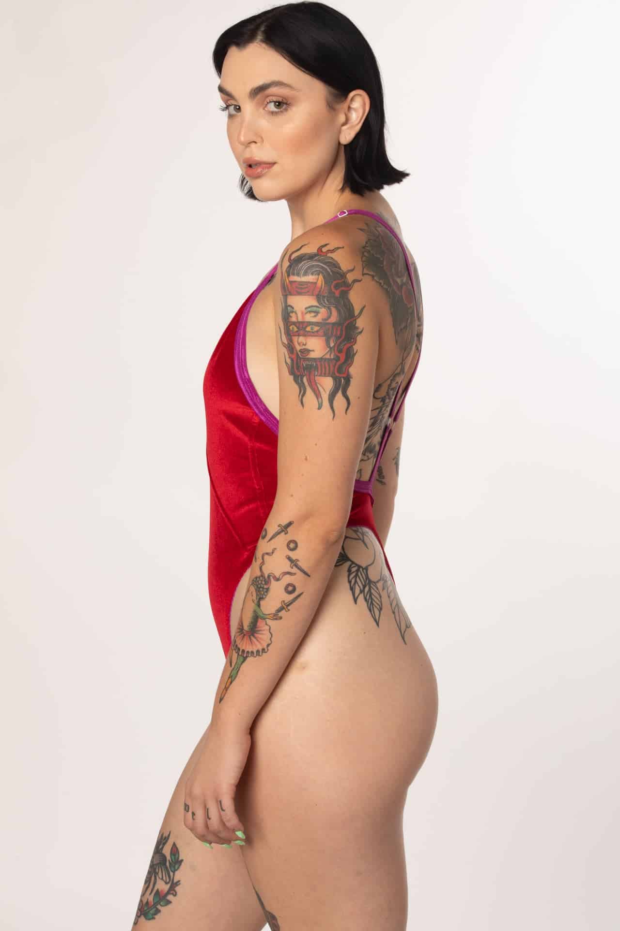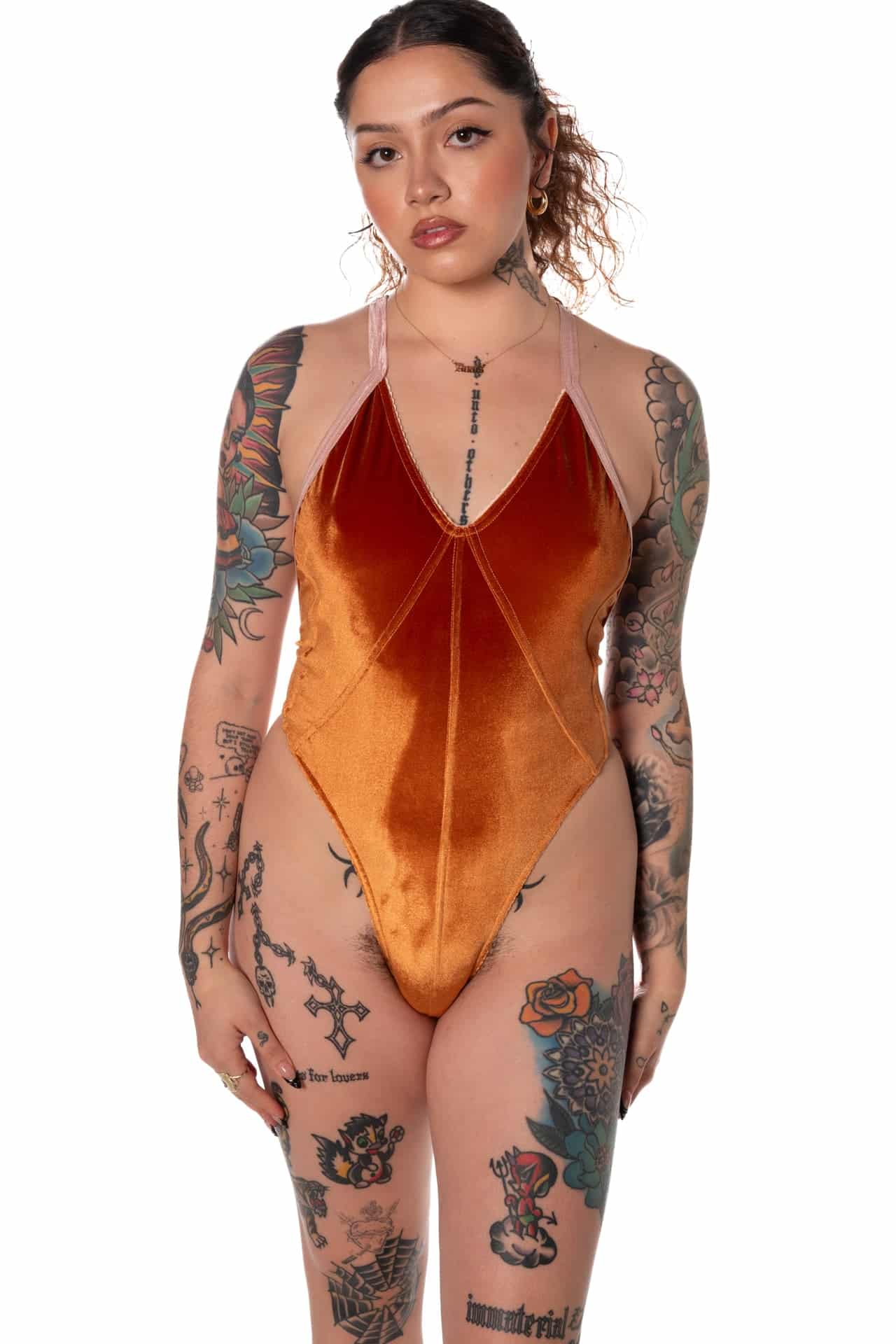 Plunging v-neck thong bodysuit with a super high hip cut in our softest solid and printed stretch velvet. Featuring fully adjustable suspender-style back straps.