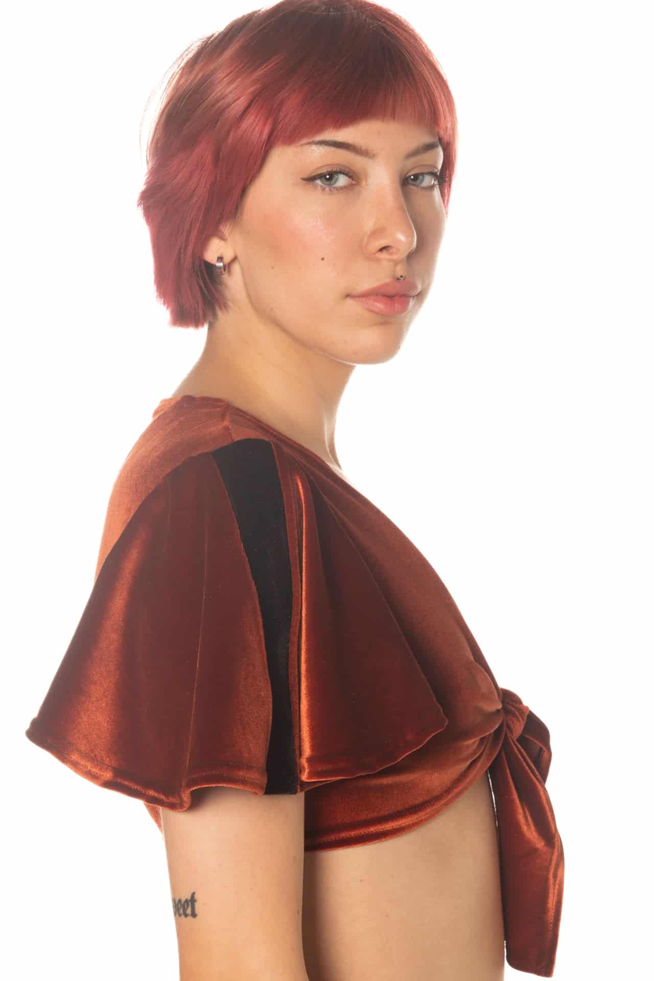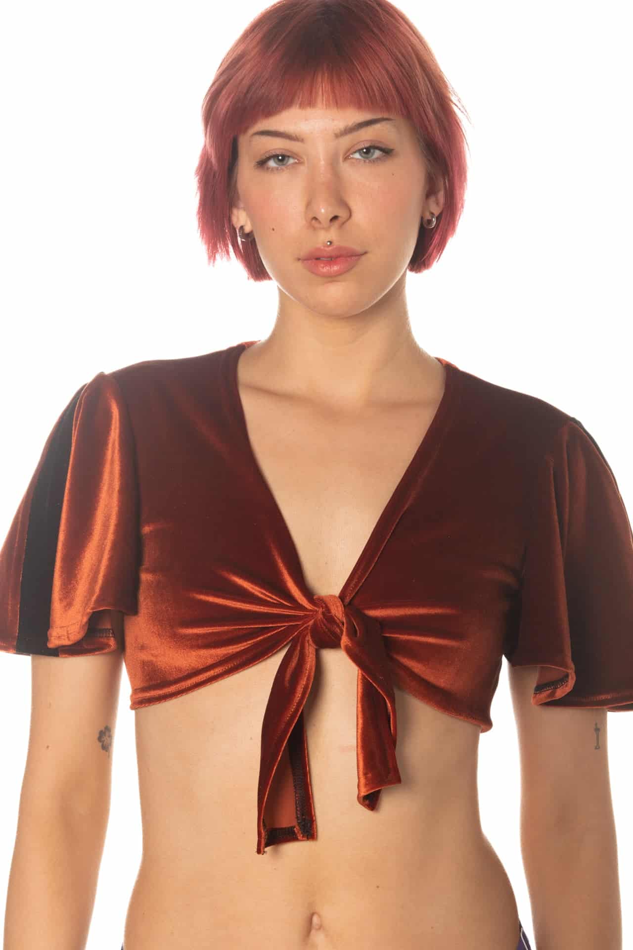 Flouncy cropped top with in our softest solid and printed stretch velvet with a tie front closure. Crop features a contrasting or matching stripe down the side of each sleeve and an elastic hem.
